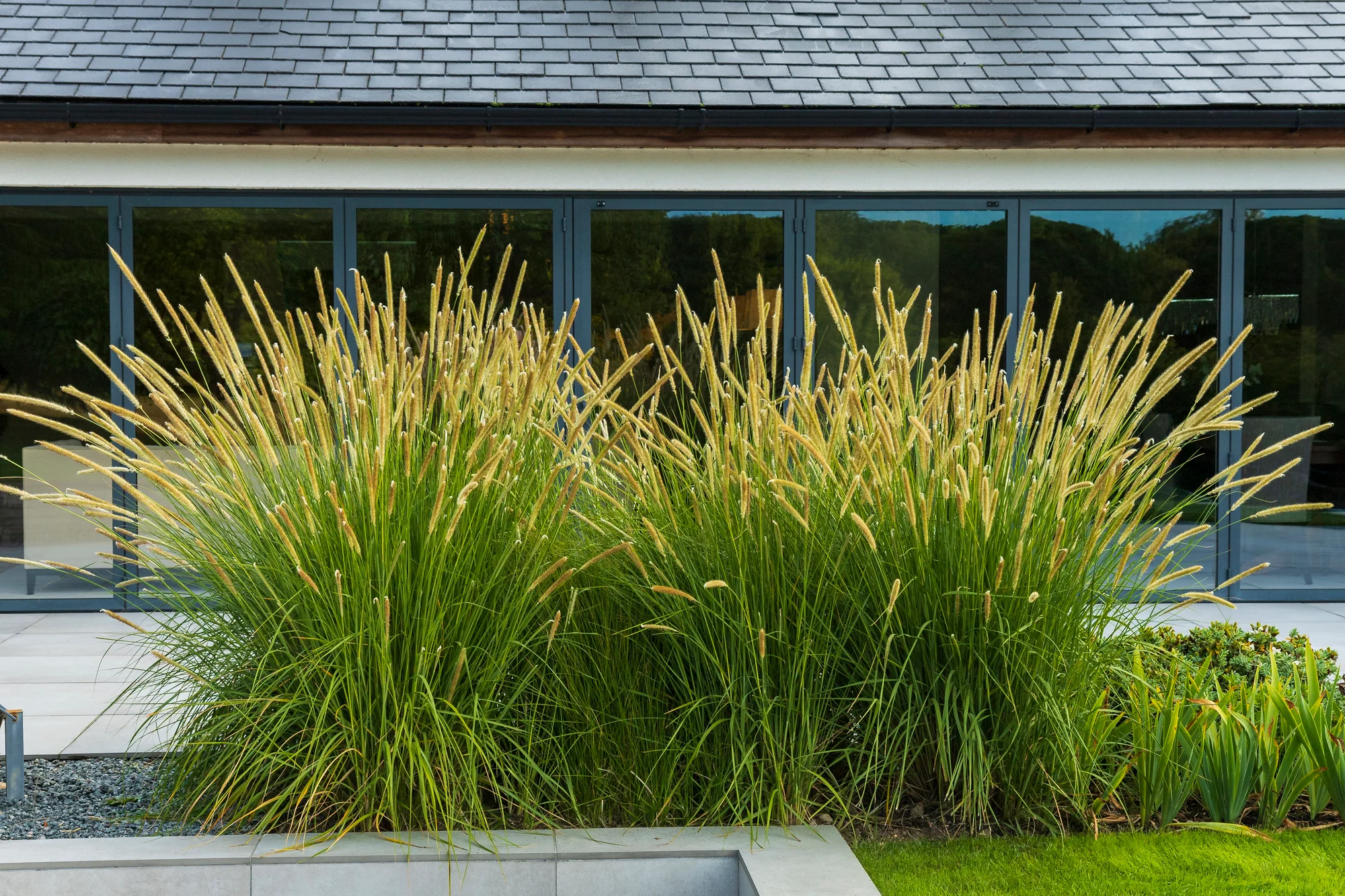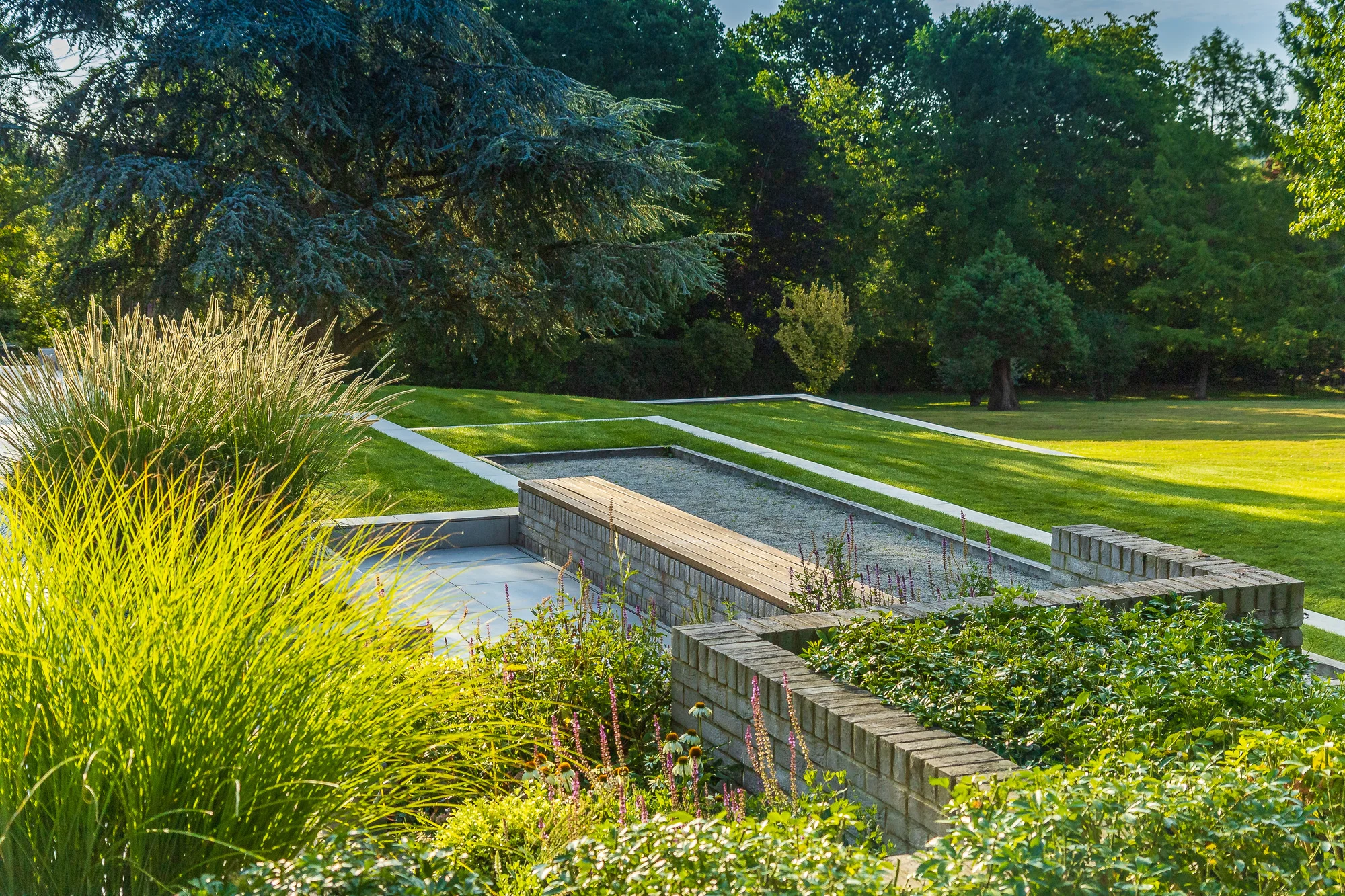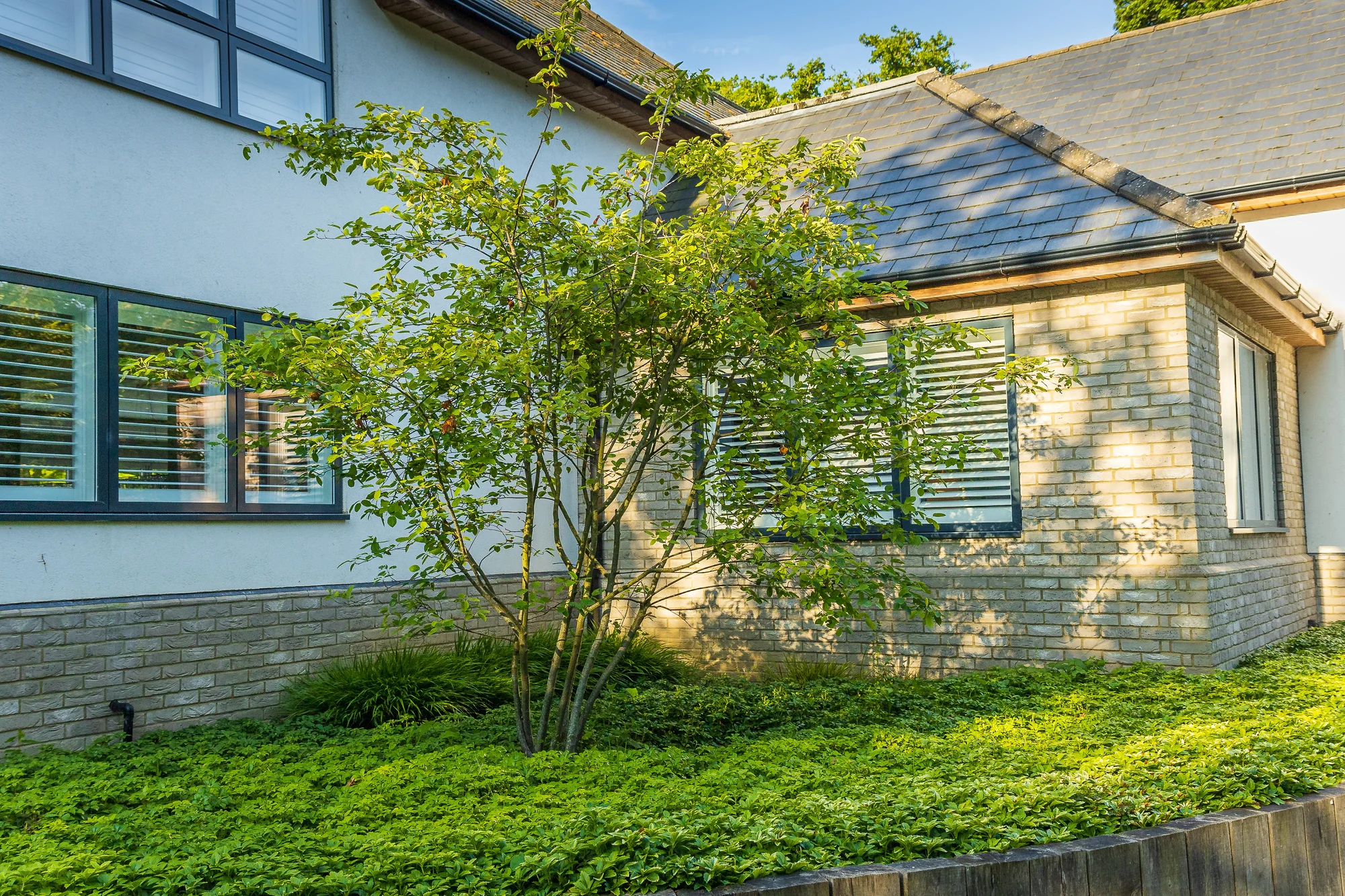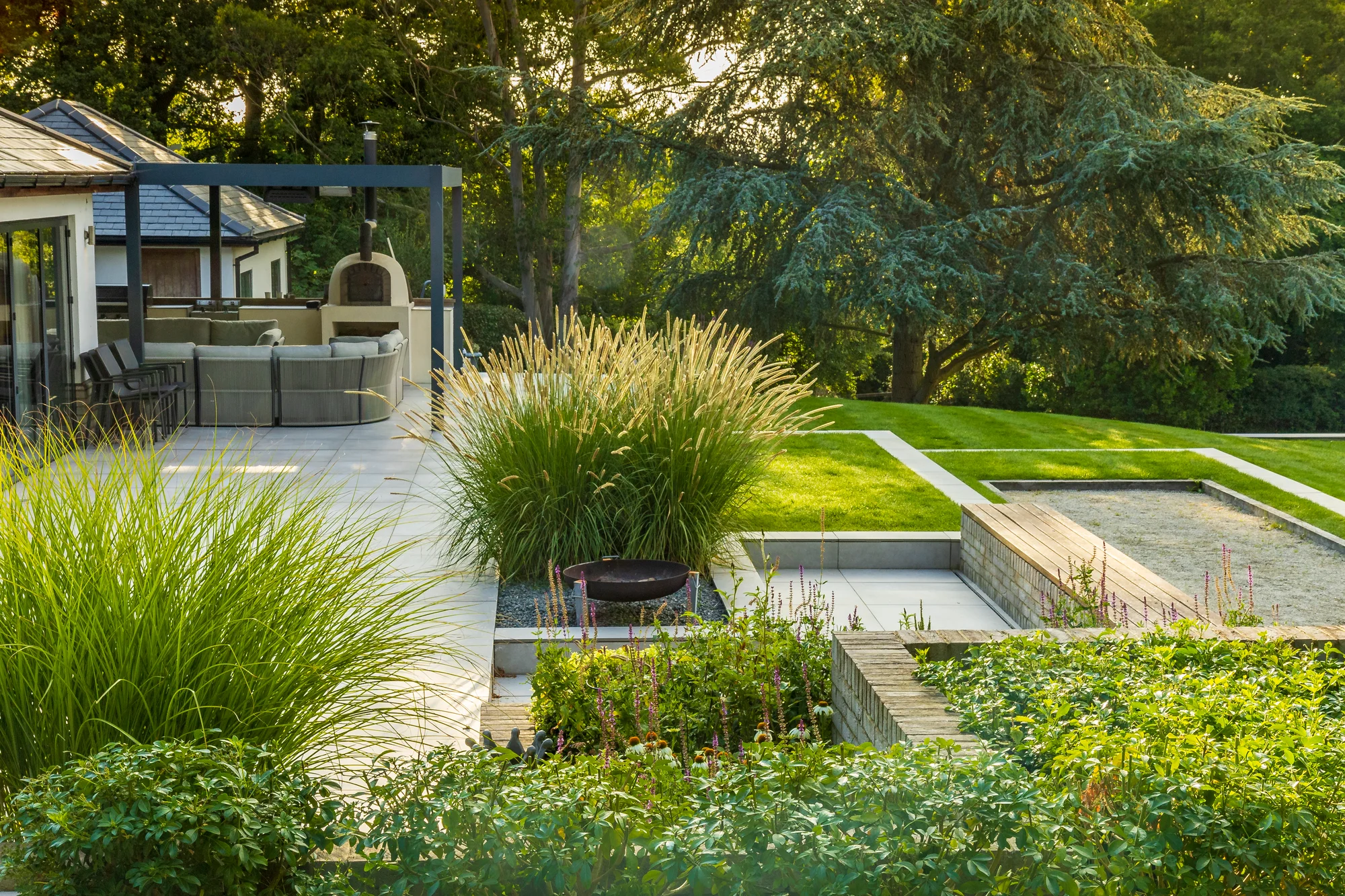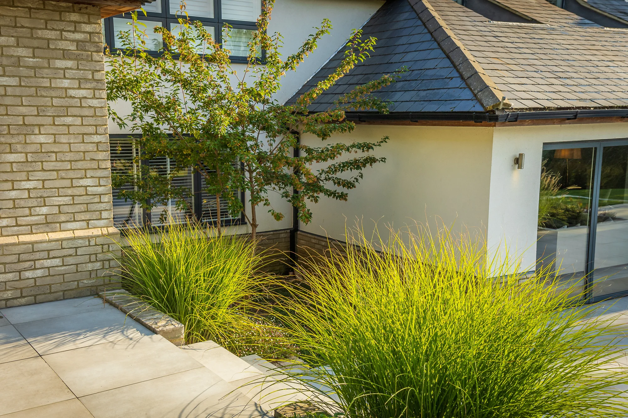 This striking modern house had only a narrow patio strip which didn’t work for a family who enjoy entertaining. The extensive garden drops away significantly from the house, which itself is on several levels. The much larger patio provides ample space for social gatherings, ties in the level changes and steps down into the garden with paving to mark the descent. The design included an outdoor kitchen, a boule court, fire pit, and ample built in seating.